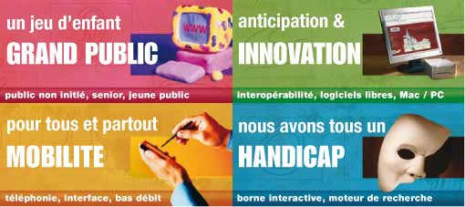 Cette problématique très large du handicap concerne l'ergonomie (handicap moteur) et la navigation (déficience cognitive), mais également les fonctionnalités et la technique (synthèse vocale, écran tactile, plage braille, ...).